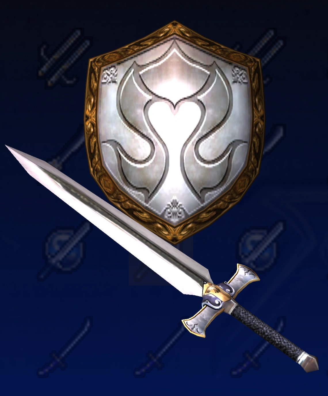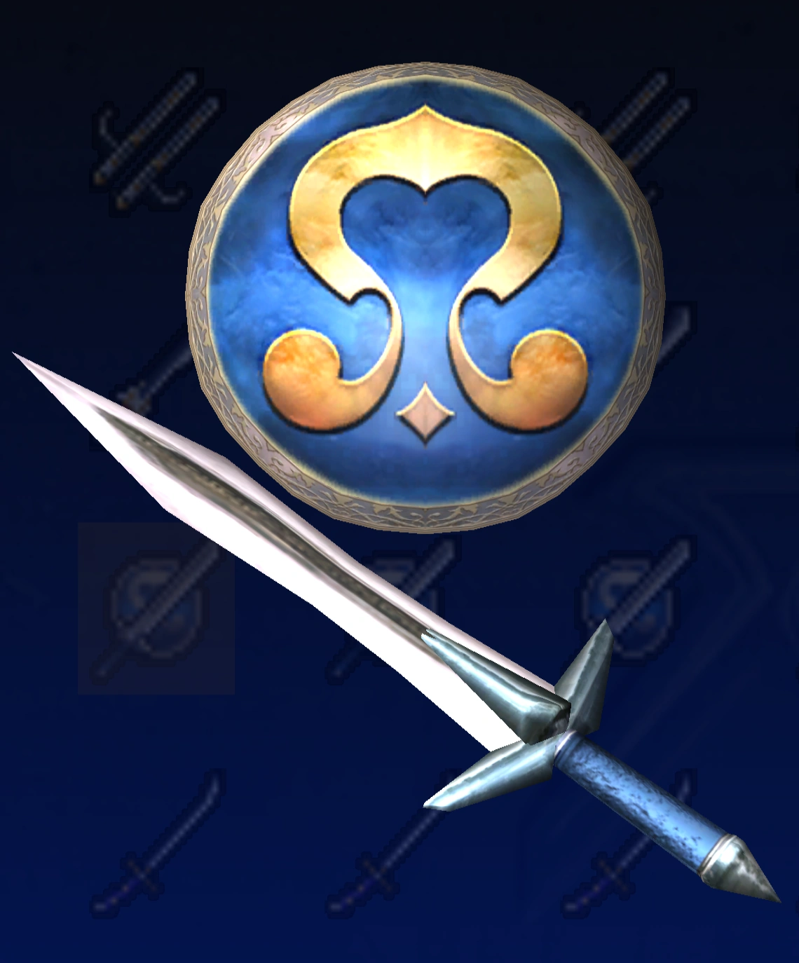 Omega Sword & Elk ShieldSwordbreakerXi Sword & Game Shield Owl ShieldBlue Crystal Rod & Blue Line ShieldFire BladeGladiusSynvalSoul Edge (Complete)OrichalcumMemento