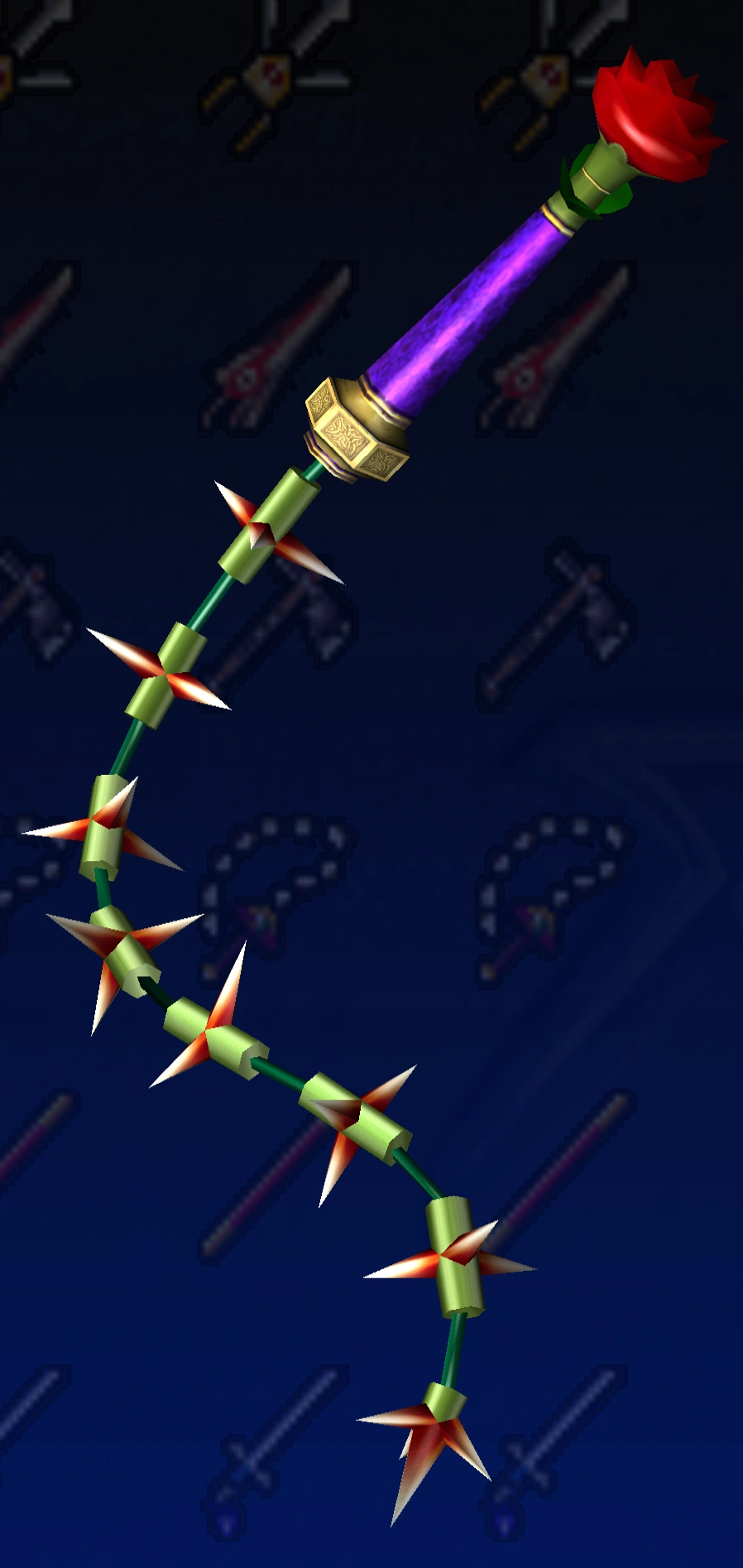 Description: A rose-like whip used in torture. Its name comes from a mysterious flower said to grow in spots where the blood of criminals has been spilled. The numerous thorns adorning the main body increase the weapon's durability as well as the threat it poses. Those who wield should do so with great care.
