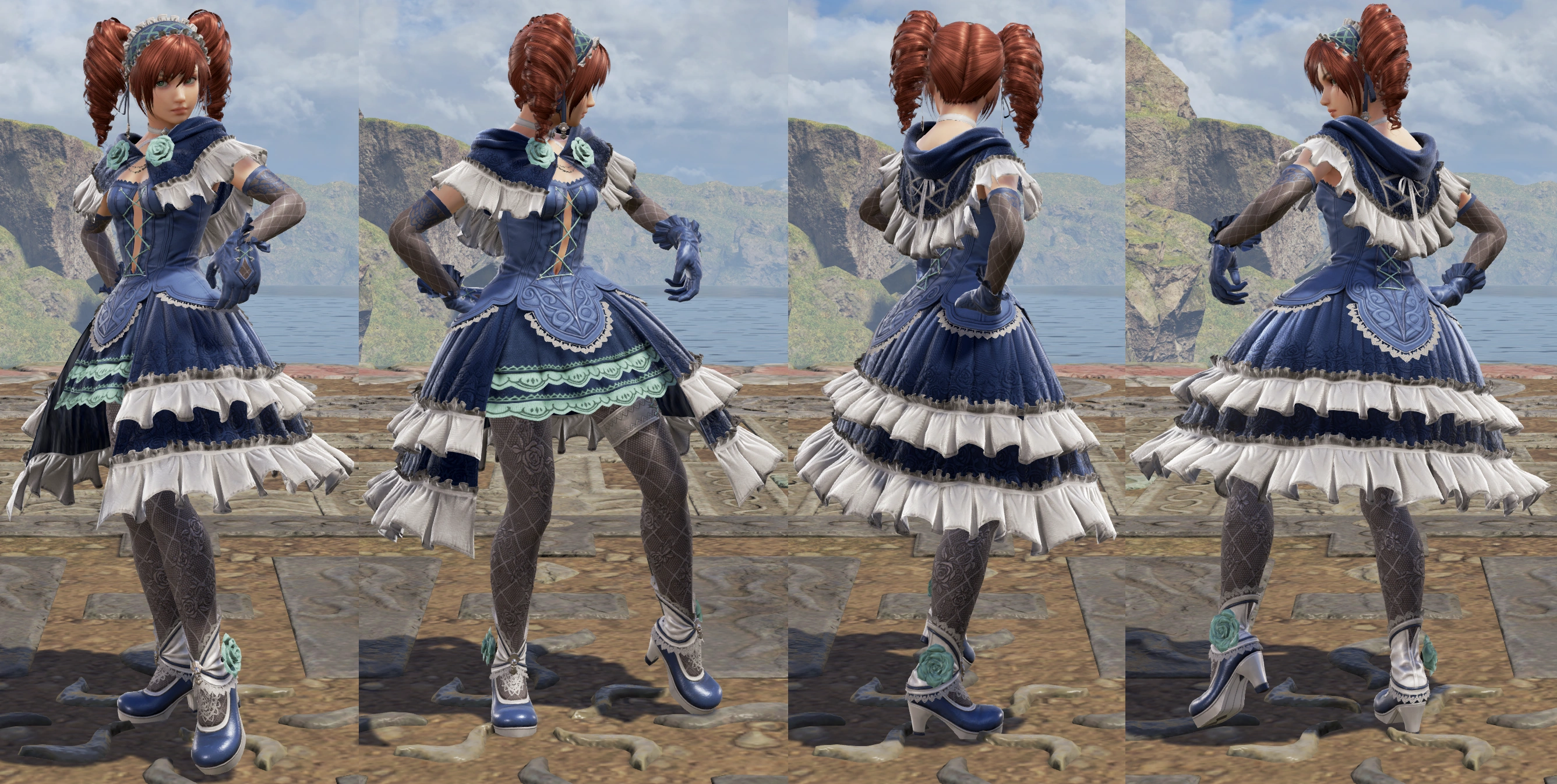 Her Color 2 recolors the black parts dark blue and purple parts blue, as well as her purple parts white. She wears matching blue gloves and shoes, as well as a matching blue headdress in this color.