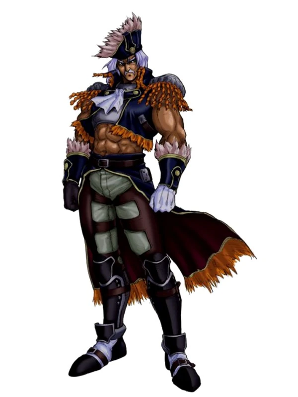 Cervantes is a mid to close range rush down character who relies on moves that knock down and launch the opponent for heavy damage output with the 2 swords. His attacks are linear and easily avoided, but once Cervantes connects with something he becomes extremely dangerous. The pistol sword is used for small attacks, checking the opponent, and attack throws, while the long sword is used for major blows. He can use both swords to stun the opponent and has a special stance (Dread Charge) used for his most powerful attacks (Geo Da Ray, Dread Slash). Dread Charge is capable of catching the enemy off guard if they don't know what move is next, but it has an extremely slow startup and most of the attacks that come out of the stance are easily punishable, so it should be used with extreme caution.
