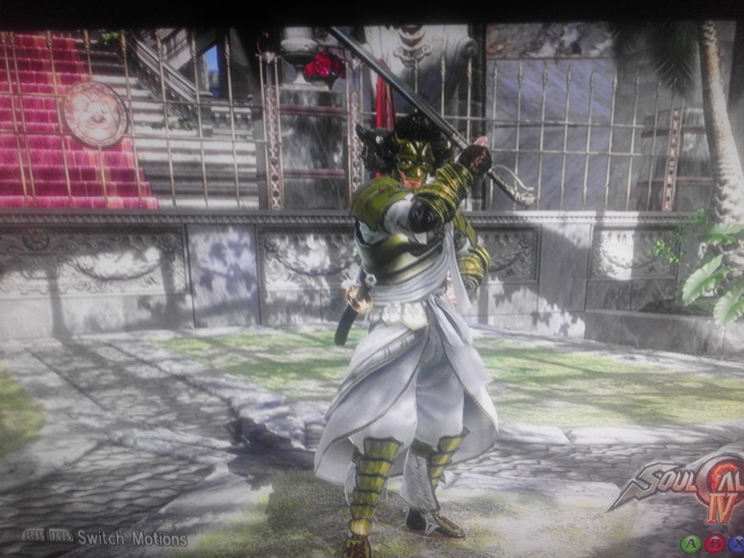 Soulcalibur V: He wears golden samurai like armor which consists of a chinese helmet with a black cloth inside the helmet and gold trim, a gold hannya mask with black horns and teeth, a pair of small samurai pads with black trim and rings, a scaly cuirass over a black short sleeved long coat with yellow trim and the Solar kingdom symbol on the back, a pair of armguards with black trim, black leather underneath and held together with a white cloth, a pair of armored shin guards with black straw sandals that have a black cloth in the back and a white bodysuit.