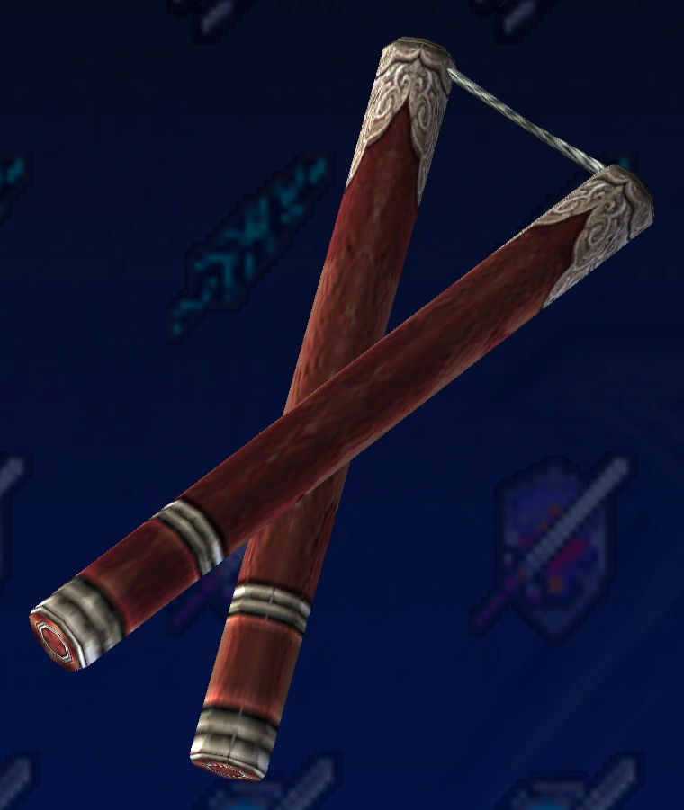 Nunchaku made by Yagaji, one of Maxi's crew. Designed to complement the pirate leader's fighting style and natural strength, they provide excellent speed, and break less easily than his other nunchaku.