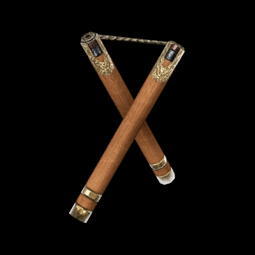 "A superb set of rosewood nunchaku made for the Ryukyuan pirate maxi by one of his crewmen. They are highly durable, but lightweight and easy to wield. They were crafted with Maxi's extraordinary strength in mind, so power from the weapon itself was not a priority."