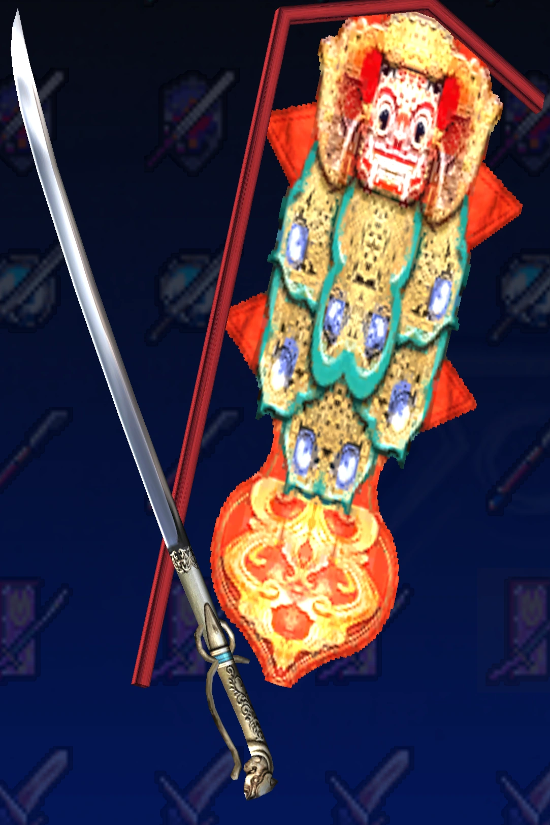 Omega Sword & Elk ShieldSwordbreakerXi Sword & Game Shield Owl ShieldBlue Crystal Rod & Blue Line ShieldFire BladeGladiusSynvalSoul Edge (Complete)OrichalcumMemento