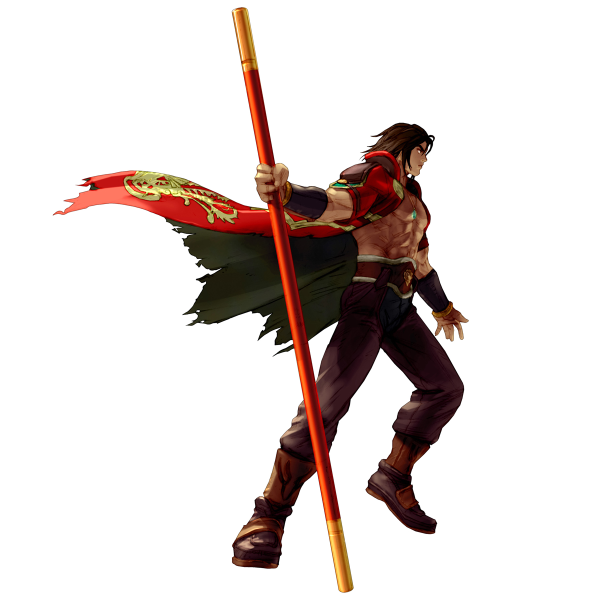 Kilik is a fair-skinned young man with a slim but well built physique, medium-length brown hair and brown eyes, possessing a distinct V-shaped scar on his left cheek. In his first appearance, he wore black and red sleeves and a pair of red pants with blue belts tied around his legs and a tattered cloth flowing from his belt. He wore the Dvapara-Yuga as his only article of clothing on his upper body, slung around his chest.