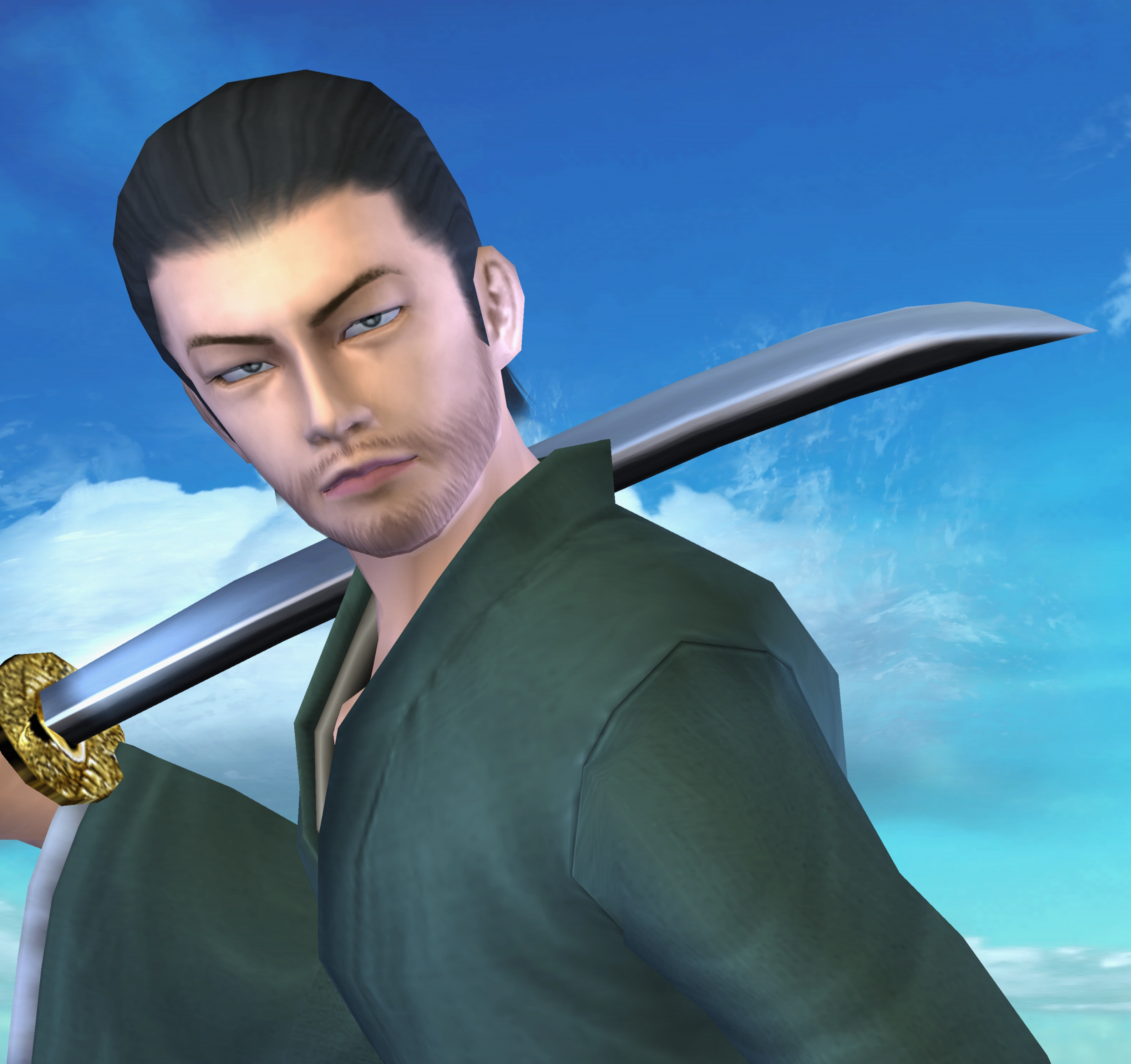 A custom character that appears in Libra of Souls using Mitsurugi's moveset. He has a unique face and hair; his face is similar to that of Male Face 10 except he has unique eyebrows and facial hair, and his hairstyle is similar to the Topknot hairstyle but it lacks sideburns. |