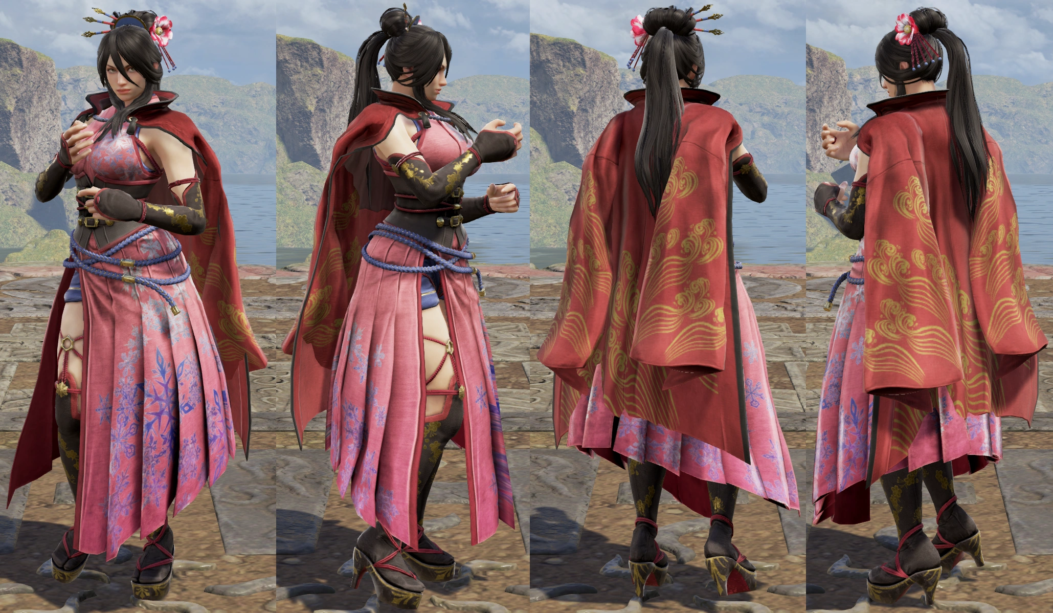 Her Color 2 recolors her whole outfit red and her hair black. This is a reference to her Soulcalibur III 1P outfit. The Color 2 also recolors her parasol red to further emphasize the similarities.