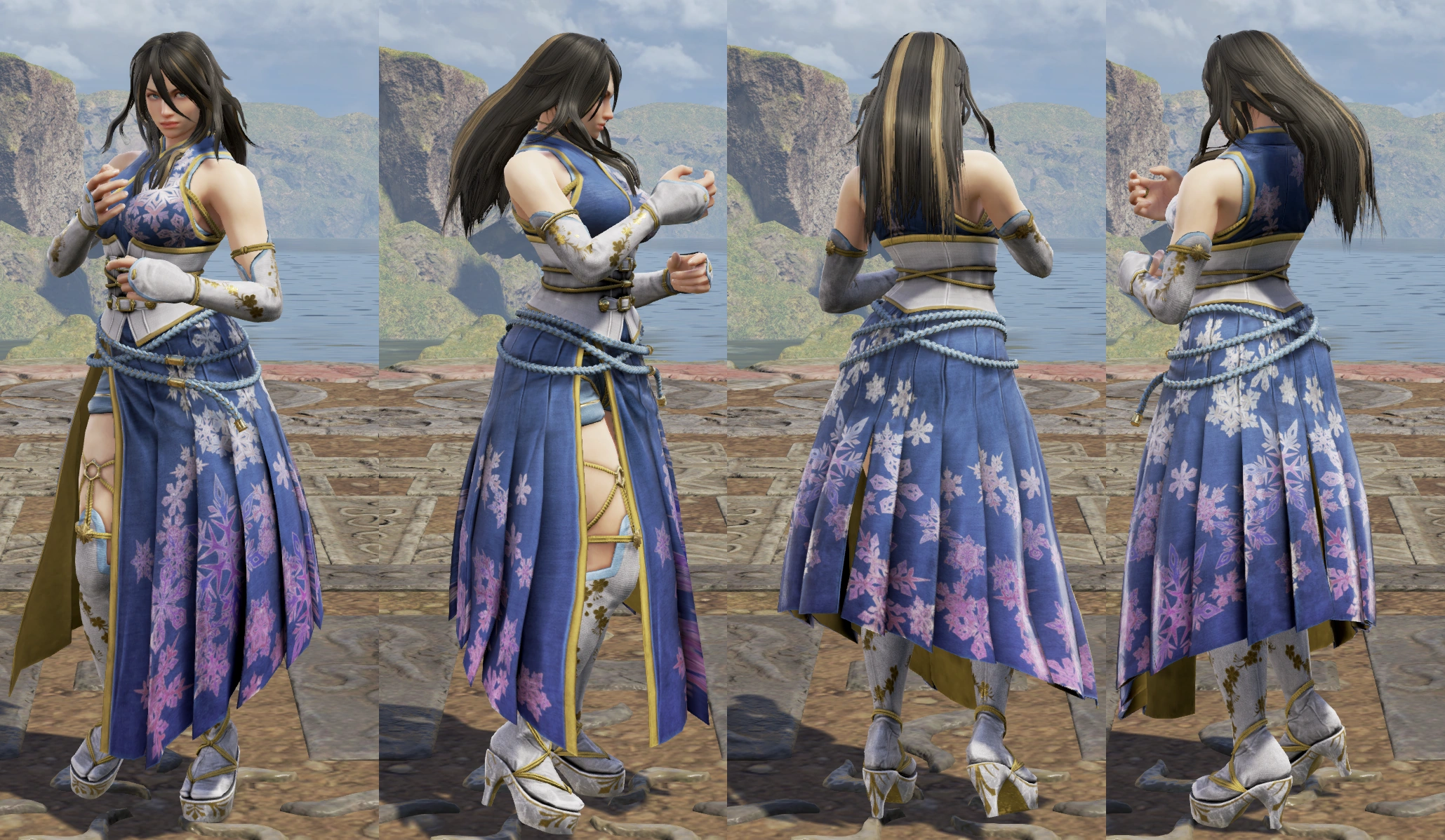 Her Color 3 removes the haori and colors her kimono blue-white and messy hair black. This may be a reference to her Victorian England themed 2P outfit from Soulcalibur IV.
