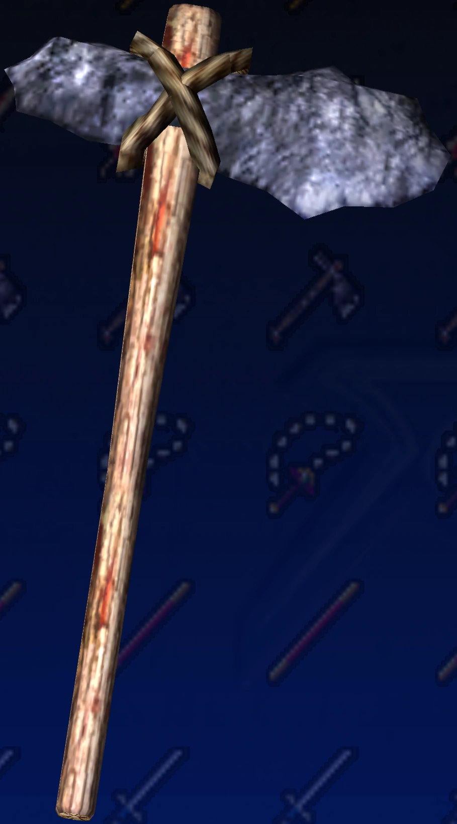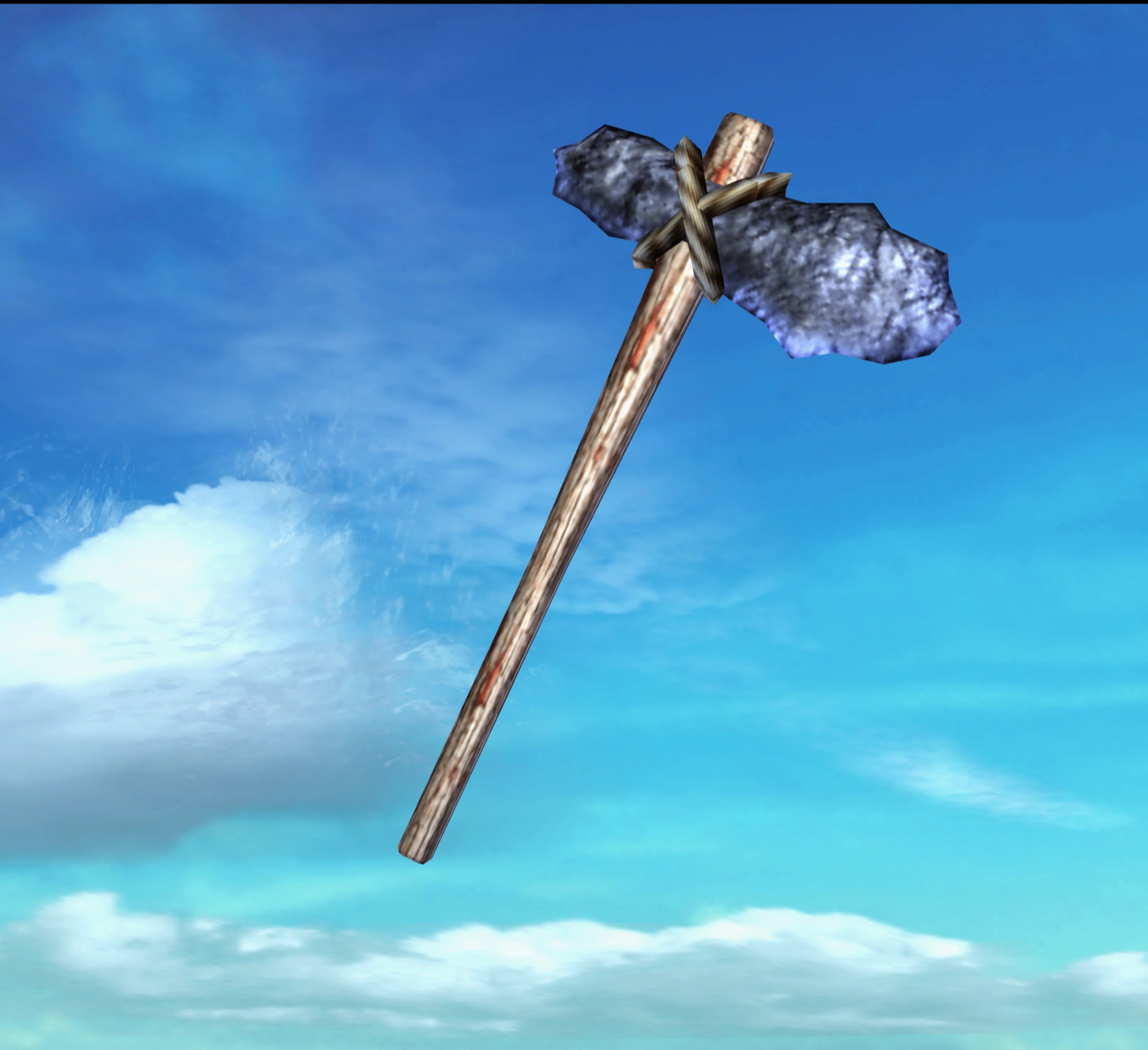Description: A rock attached to a stick. It is a very primitive weapon, but as heavy as it is, its damage-dealing ability should not be underestimated. It looks somewhat silly, so it may lead many opponents into letting down their guard.