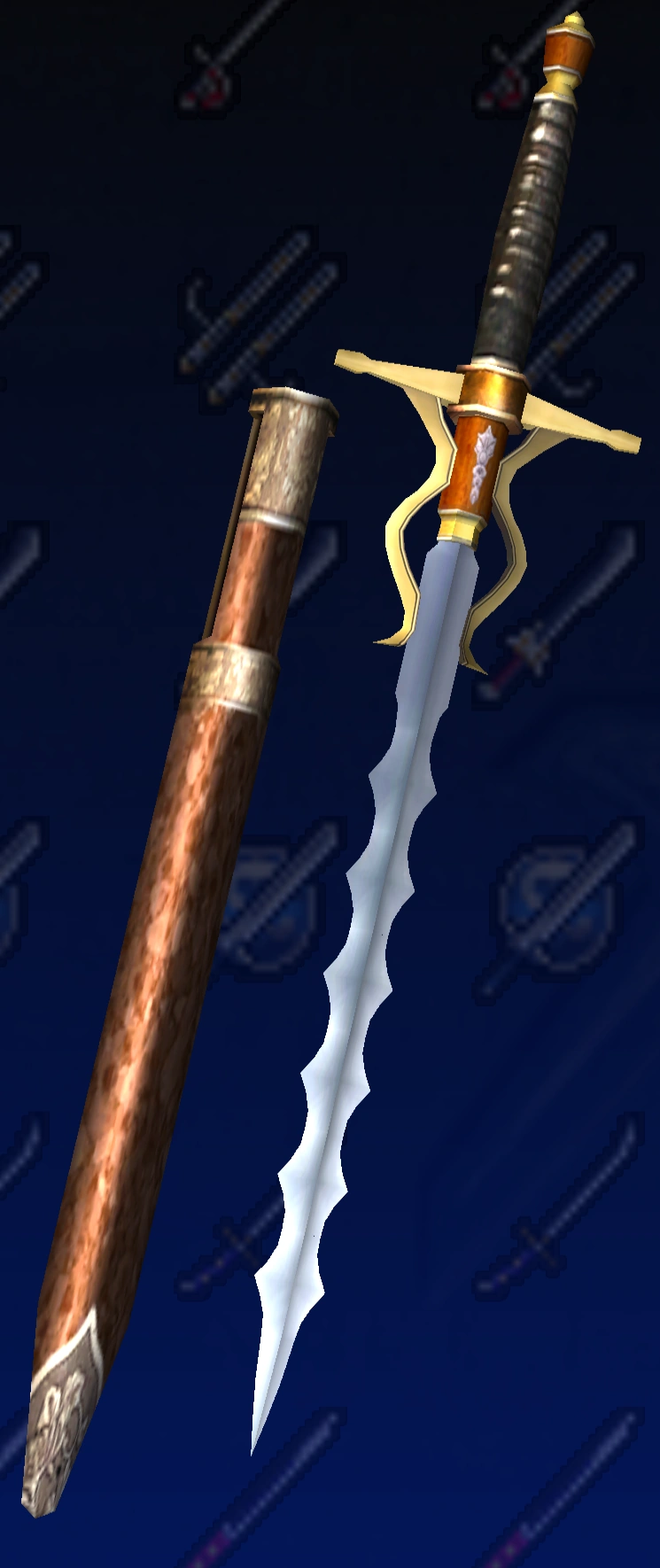 Description: A Western sword with a beautiful wavelike design. Despite its elegant appearance, it is actually extremely practical. Additionally, its decorative design allows deeper wounds to be cut, but at the cost of some durability.